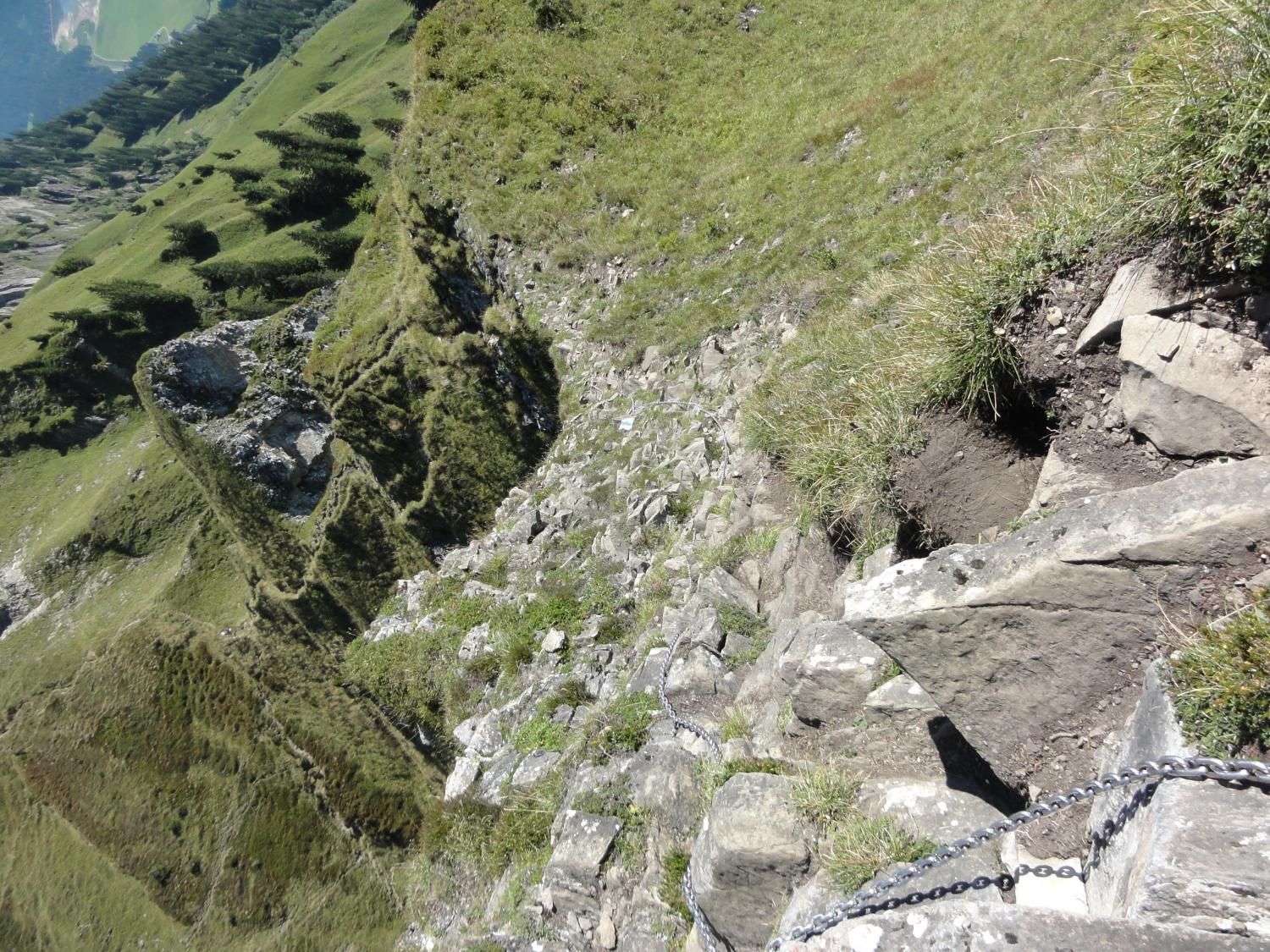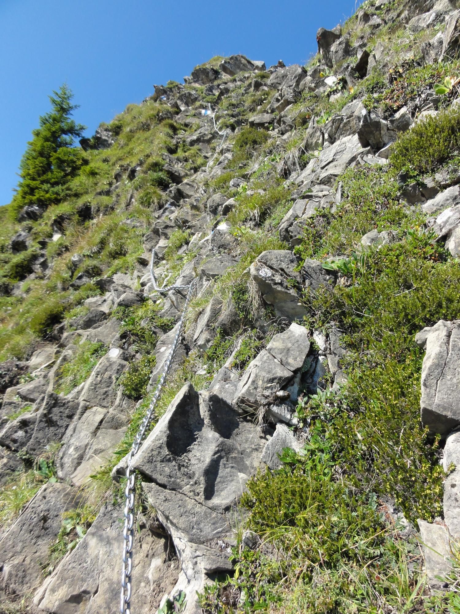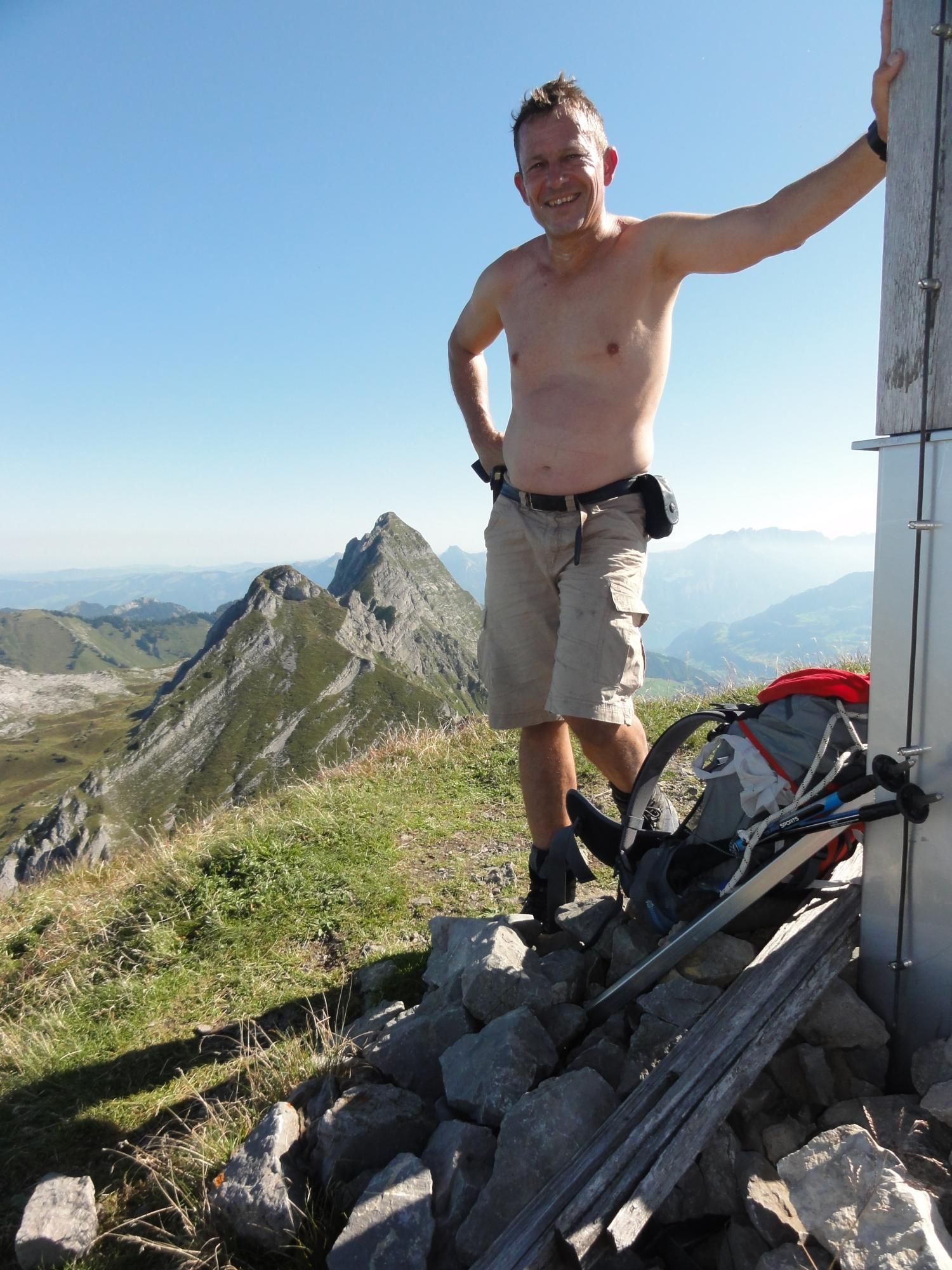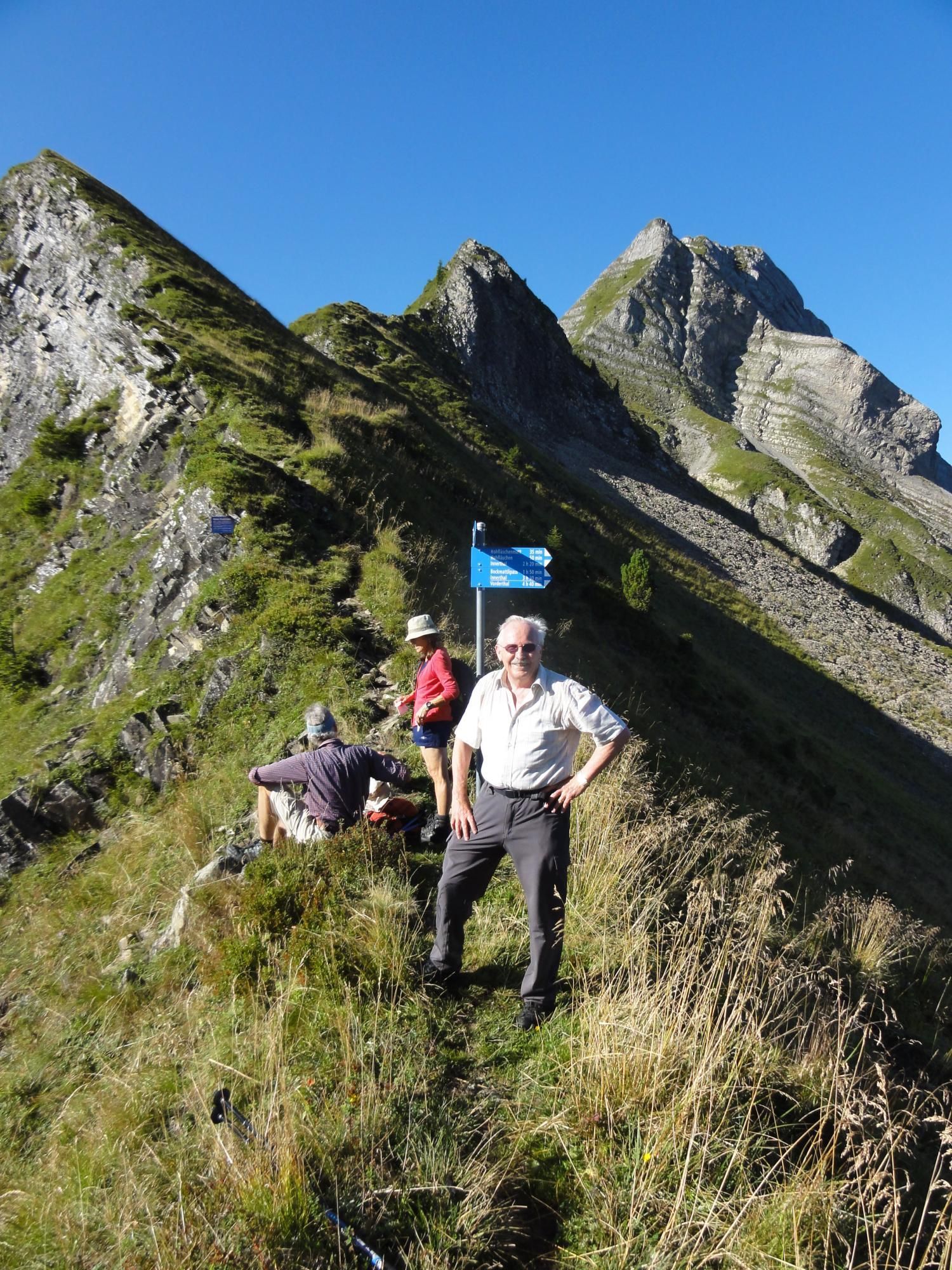 Für die Zindlenspitzbesteigung möglichst wenig Gewicht mitnehmen, dafür genügend Flüssigkeit. Jedes Kilogramm weniger erleichtert den Aufstieg. Das habe ich gespürt und auch wegen des beginnenden Muskelkrampfs den Aufstieg zum Gipfel am Punkt 1902 abgebrochen und Dani allein, bzw. in Begleitung mit einem Ehepar, ziehen lassen. Der Aufstieg zum Gipfel ist ab Hohfläsch gut in 2 ½ Stunden zu machen. Der Weg am Grat und zum Gipfel ist mit Ketten sehr gut abgesichert.