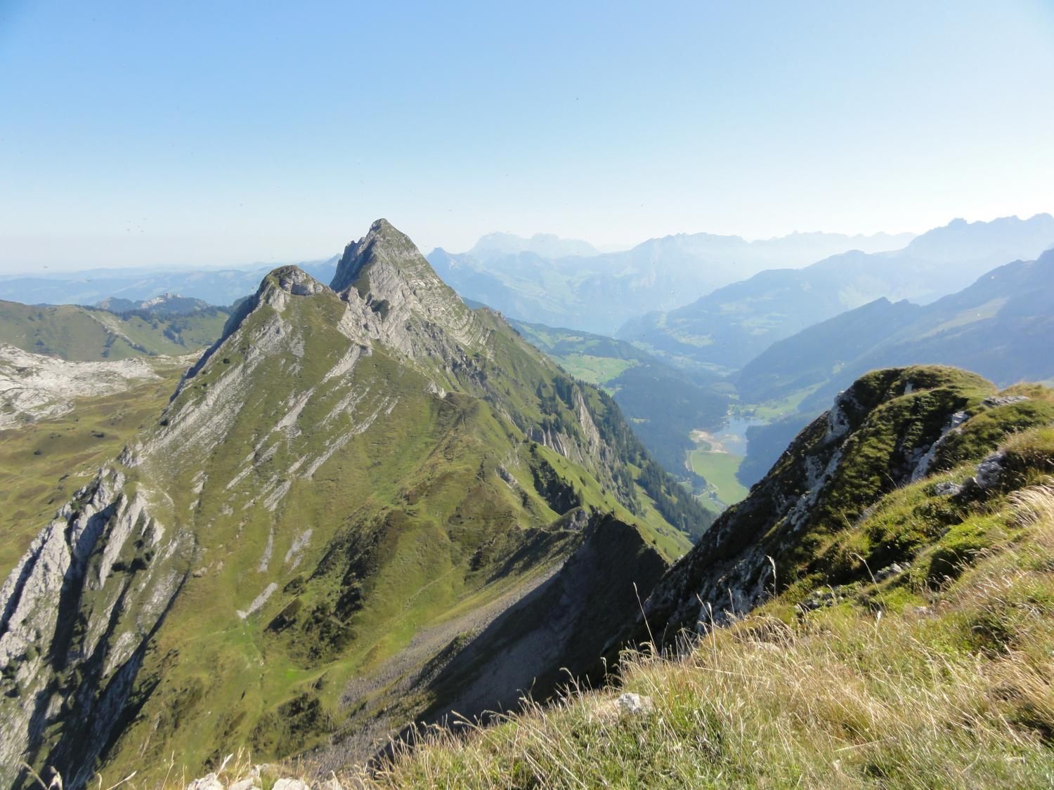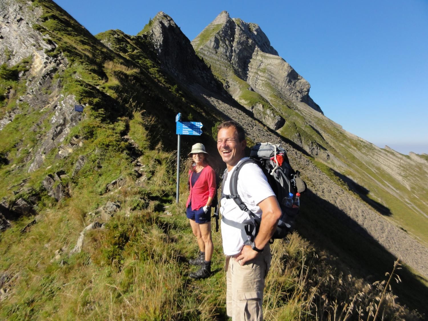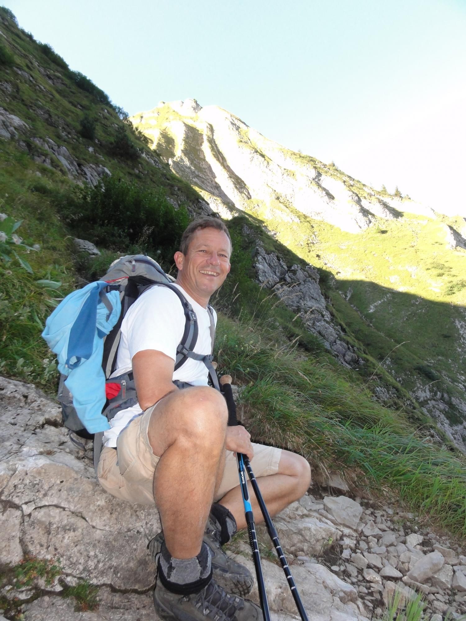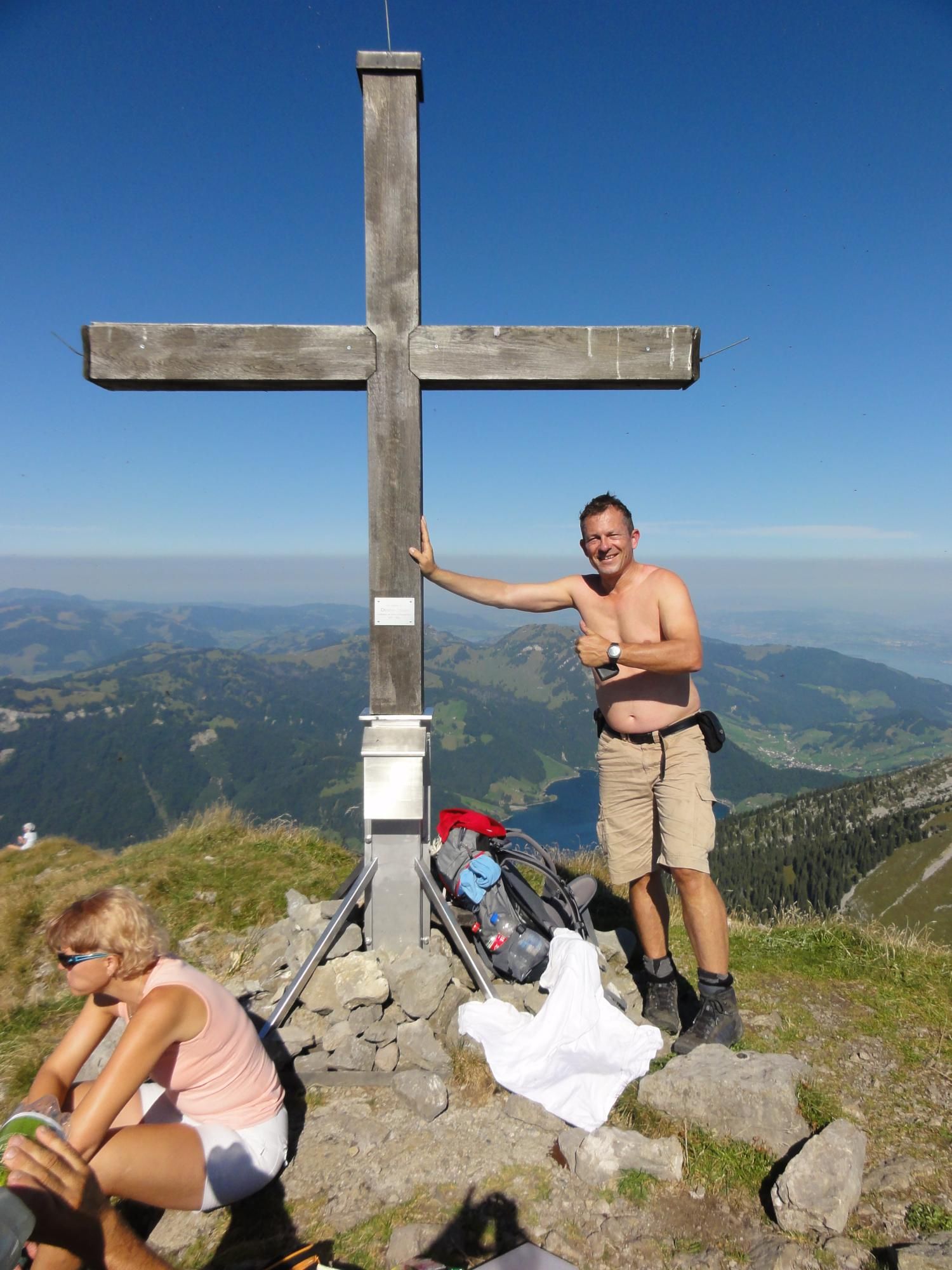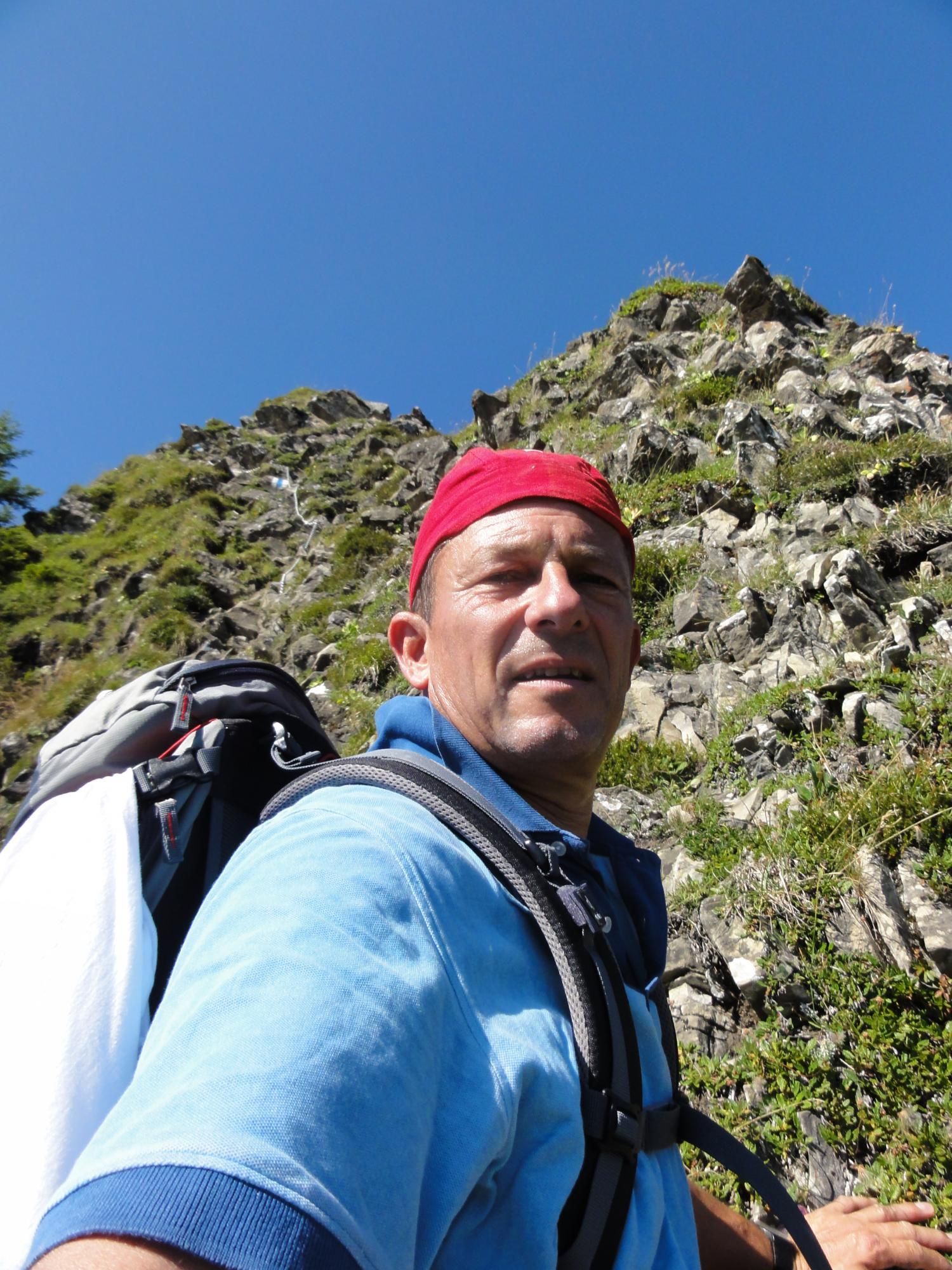 Für die Zindlenspitzbesteigung möglichst wenig Gewicht mitnehmen, dafür genügend Flüssigkeit. Jedes Kilogramm weniger erleichtert den Aufstieg. Das habe ich gespürt und auch wegen des beginnenden Muskelkrampfs den Aufstieg zum Gipfel am Punkt 1902 abgebrochen und Dani allein, bzw. in Begleitung mit einem Ehepar, ziehen lassen. Der Aufstieg zum Gipfel ist ab Hohfläsch gut in 2 ½ Stunden zu machen. Der Weg am Grat und zum Gipfel ist mit Ketten sehr gut abgesichert.