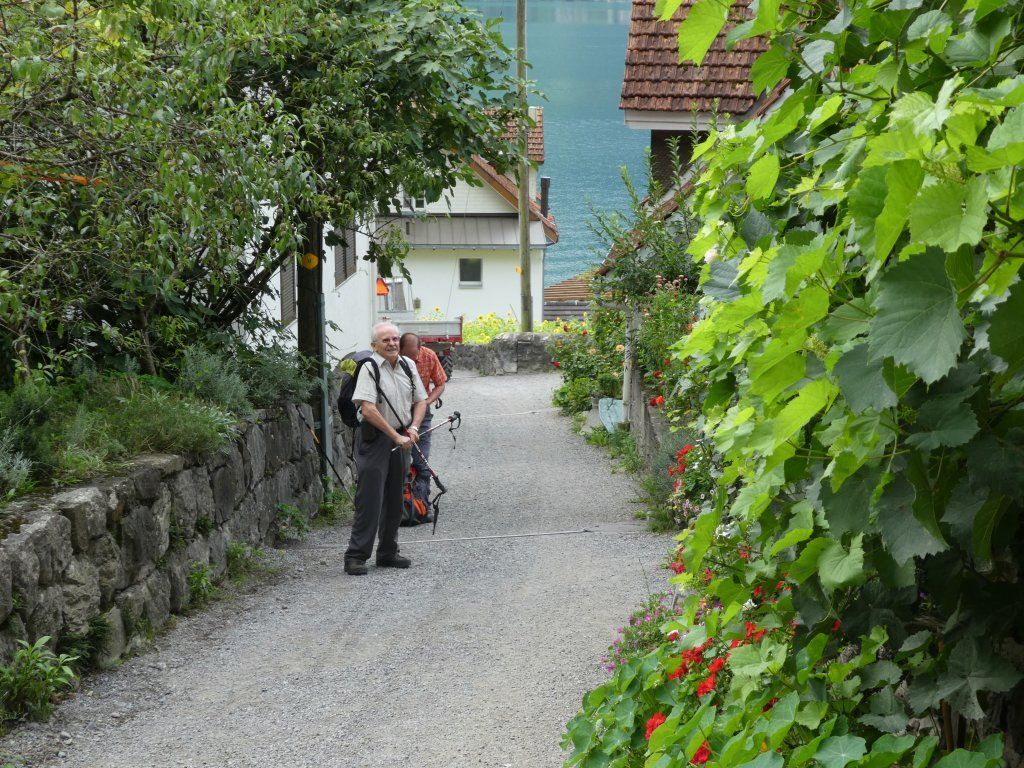 09:00 Uhr am Start in Quinten. Die Länge der Wanderstöcke muss noch korrekt eingestellt werden!